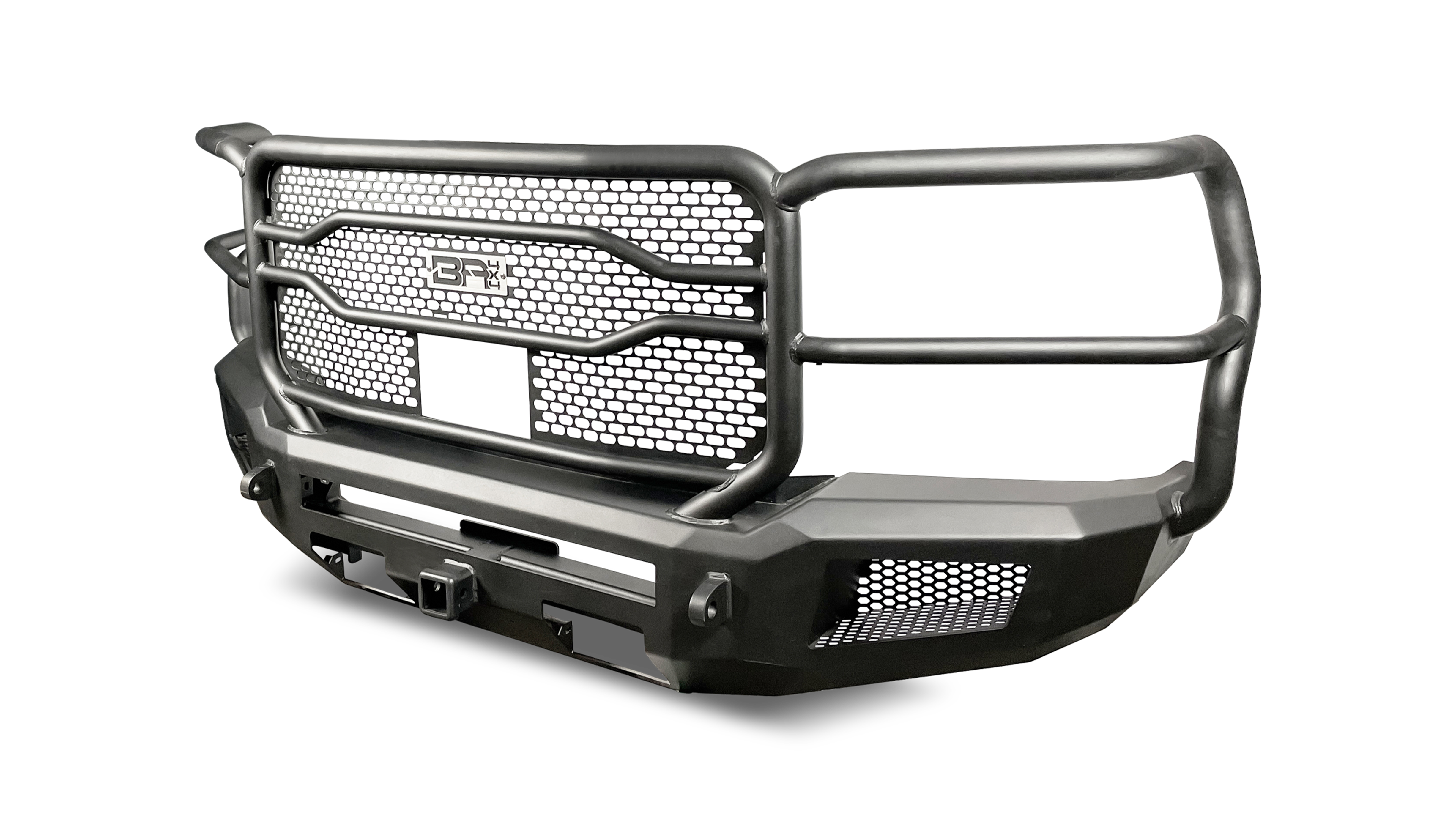 SLEEK MODERN DESIGN WITH AMPLE CLEARANCE; CONTOURS AND FOLLOWS BODY LINES; ONE-PIECE WRAP AROUND DESIGN PROTECTS GRILLE AND HEADLIGHTS; 2″ MAIN TUBE AND 1.25″-1.50″ SUPPORTING TUBES; RETAINS FACTORY CAMERA AND ACC; MESH SCREEN ALLOWS MAXIMUN AIRFLOW WHILE PROTECTING VITAL COMPONENTS; INTEGRATED 2″ RECEIVER AND SHACKLE RECOVERY MOUNTS; LIGHT FITMENT: 30″ DUAL ROW LED BAR AND 4 CUBE LEDS; NOT-WINCH COMPATIBLE; 3/16″ AND 1/4″ COLD ROLL STEEL; EASY BOLT ON INSTALLATION; DURABLE TWO-STAGE LIGHT TEXTURE BLACK POWDER COAT FINISH; 3 YEAR FINISH / LIMITED LIFETIME