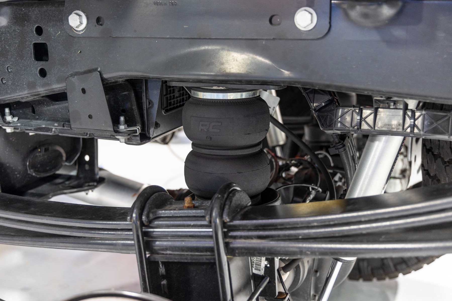 Ideal Leveling. Is your truck your workhorse? The main attraction to the pick-up line is the accessibility to haul and tow as desired. However, due to the amount of weight in the bed, or the condition of the vehicle’s rear leaf springs, this can cause the vehicle to be un-level when under load. Here at Rough Country, we created an innovative new product to ensure that these are troubles of the past. Introducing, Rough Country’s Rear Air Spring Kit.Heavy-duty Construction. Rough Country’s Rear Air Spring Kit features two RC branded high-quality double convoluted airbags complemented with DOT-approved airlines. Whether you plan on towing or hauling in the not-so-distant future Rough Country’s Air Spring kit is the must-have accessory to ensure that your trailer is level reducing the weight off of the tongue of your trailer.  Each kit offers 1/4″ push connector fittings and all of the bracketry needed to ensure installation is lightning fast and secure! Rough Country’s Air Spring kit provides up to 5,000 lbs of load support to ensure that you experience less sway and bottoming out when braking and steering!