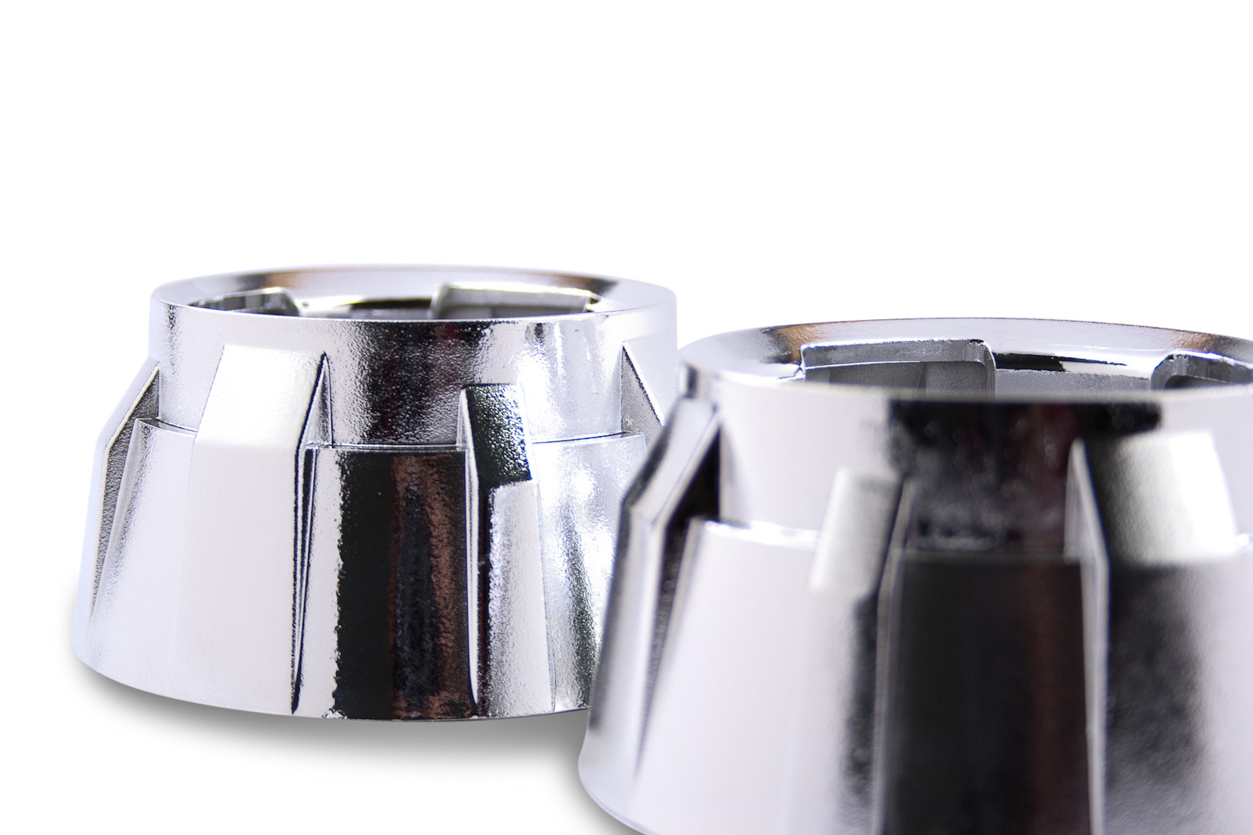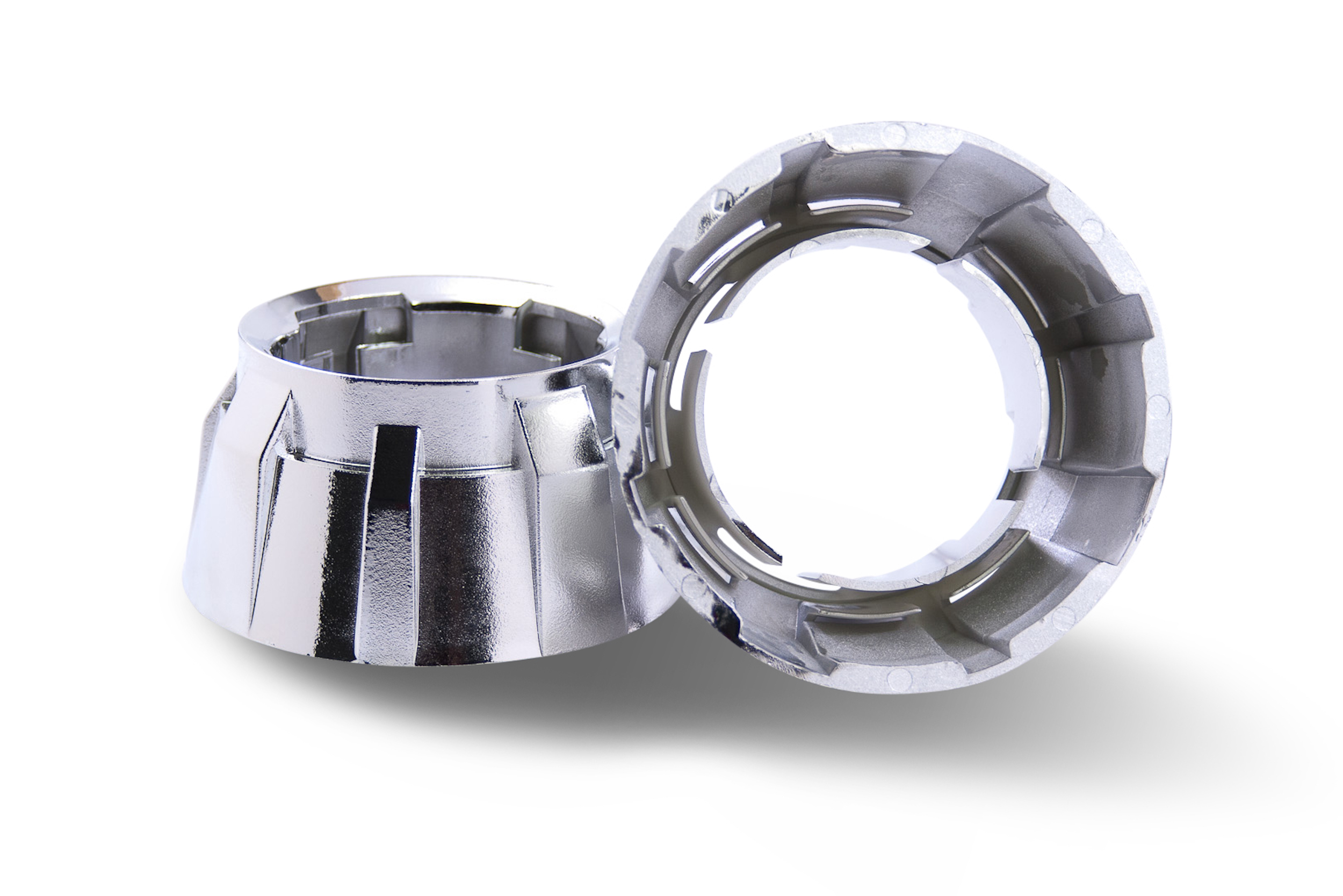Gatling Gun 1.0: Inspired by a machine gun, these shrouds have blocks arrayed around their perimeter and a textured metallic-looking finish giving them a more radical look. With Integrated lighting vents, textured metallic surface finish, and a modern design all combine to give the Gatling Gun 1.0 shrouds their unique appeal. In Comparison: Don’t make the mistake of thinking all shrouds are created equal. Even though less expensive alternatives may be available elsewhere: Morimoto shrouds are made from the highest quality plastic and have by far the most durable metalized chrome finishes. The cheapo’s out there are flimsy enough to deform from the heat just a 35W HID bulb, and their chrome finish easily flakes off. A or B: At our shop, we’re also meticulous with quality control. If a shroud has a minor factory defect; we sell it at a discount as a “B stock” unit – which is perfect for budget retrofits or when painting them is part of the plans. If you won’t settle for anything less than perfect and plan to leave them chrome; go for the “A Stock” Shrouds. Mounting: Centric Rings are not included by default, but are highly recommended to improve ease of installation on many projectors. The Centric Rings are simple reducers that clip into the shroud to reduce the inside diameter, making them more of a “press fit” onto the lens holder of the projector. JB Quik Weld is also recommended in order to prevent the shrouds from vibrating loose over time. LED Halos: Are a unique and effective way to further customize the look of your projector retrofit. The all new Profile Pivot (switchback) and Profile Pixel (RGB) systems are easy to mount on the front of your shrouds, are reliable, and of course awesome looking. To determine which size is best for you – check out the size-guide in the images above. These shrouds feature DRL-Vents that will glow with light if you wanted to do something a bit different and mount the halos inside. Trimming: Please note that trimming shrouds is a common task when retrofitting. Whether required to clear part of the projector, or fit within the geometry of your headlight housing; it’s normal. Luckily, they’re made of plastic – making that easily possible. We recommend a Dremel hand tool with EZ Lock cutting wheels to make the job easy.
