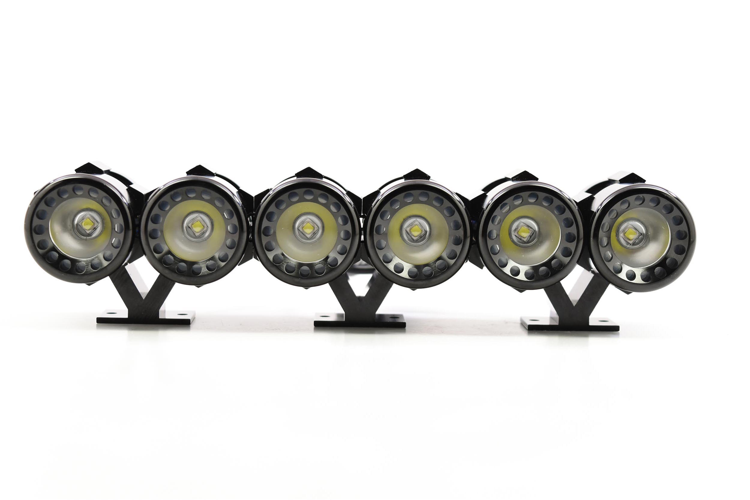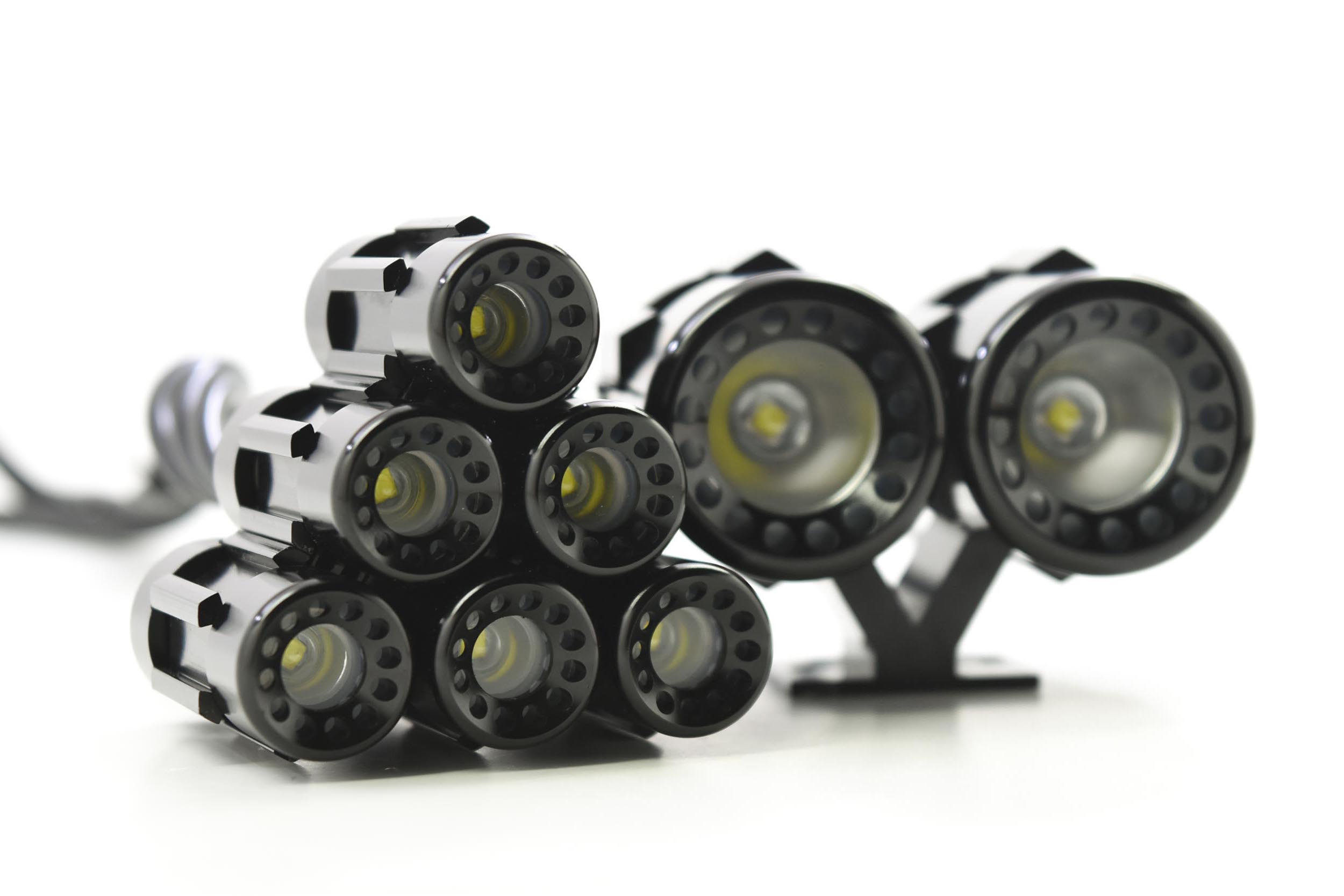 Combinations: What do you get when you pair two different LED setups, three color lens options, and three different mounting styles? A huge variety of possible configurations! They are really whatever your creativity allows, and THAT is why more than anything… .put simply Morimoto’s new ModPod Minis are an awesome way to add custom auxiliary lighting to your car, truck, or motorcycle! Construction: Their CNC 6061 anodized aluminum body is basically bomb proof. Not only does it look great with it’s drilled out bezel (that provides a pseudo-halo effect) – but it protects the goods inside. Designed for use either inside a headlight or on your bolted to your brush guard -they’re built to last. Wiring: Simple! Each pod only has three input wires. Depending on which LED setup you choose, they’ll have one ground and a positive for the white (or bright) mode along with a positive for the amber (or dim) mode. Accessories: Step one: imagine the perfect setup for your application. Step two: pick out your mounting points and colored lens options. Step three: rock n roll! For more details on all of the available parts, check out the dedicated accessories listing. Daytime Running Lights: Choose the dual-intensity LED setup with the white-output lens to build a custom array of slick looking dual intensity daytime running Turn Signals: Choose the dual-intensity LED setup and the amber-output lens to build a custom array of slick looking dual intensity turn signals, or opt for the switchback model for a snazzy white/amber dual function light. Reverse Lights: Choose the dual intensity LED setup with the white-output lens, wire up only the high-intensity input, and see like never before as you roll in reverse! Off-Road Lights: Choose the dual intensity LED setup with the white-output lens, wire up only the high-intensity input, and melt mosquitos with some miniature off road lights.