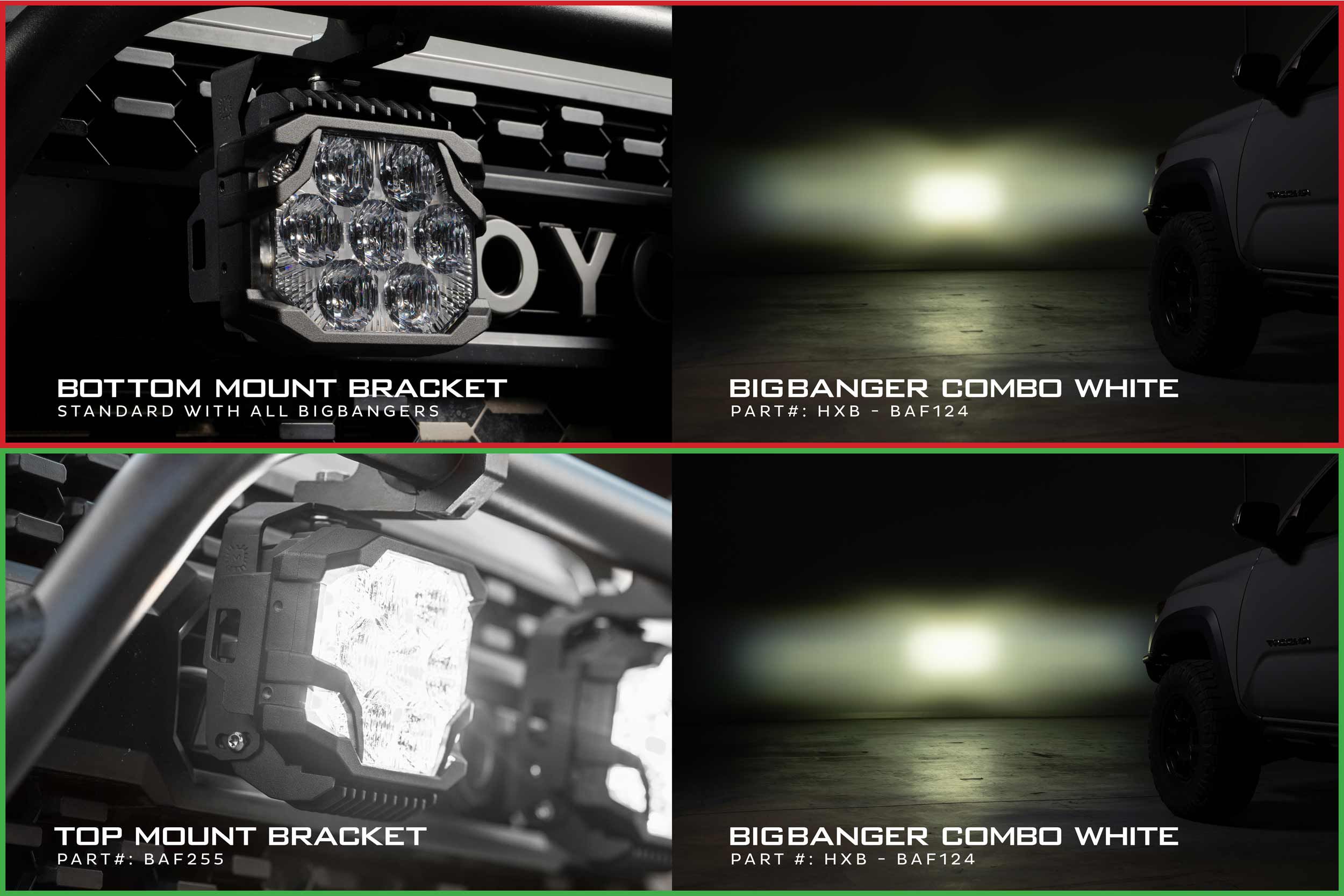 Bolt on Brighter: It’s big. It’s heavy. It’s expensive, but nothing else out there can compete with the BigBanger LED Pods, especially given their relatively compact size in their class. That advantage has led many to desire a BigBanger hanging from their front bumper, but without the right mounting brackets to do it. These brackets are the perfect solution. They will allow you mount from above, while maintaining a low profile and a proper beam pattern (since the pod and its optic should not be mounted upside down). Top Shelf: Each bracket is laser cut from 304 stainless steel, then powdercoated. New stainless steel mounting hardware is included. These brackets are sold each and match the OEM+ quality of the Morimoto offroad LED pods themselves. Universal: The brackets mount to the pods from the side, and to any surface from the top, making them perfect for hanging a BigBanger LED pod from a steel bumper or roof rack. The mounting points on the side also allow the pod to swivel, making for an adjustable aim. Performance: Just like the brackets, every element of the patent-pending BigBanger LED pod light is proprietary. LucidShape was used to optimize performance around the most modern, lumen-dense LEDs from Nichia and Osram. Optics are produced according to world-class standards. Thermal dynamics have been optimized using SolidWorks. The BigBanger is available with two industry-leading beam patterns: Spot and Combo. High Quality: Designed, Engineered, Tested in Atlanta, Georgia to meet and exceed the high expectations of Morimoto customers. These products are built to a high standard, and that’s why they are backed with a lifetime warranty.