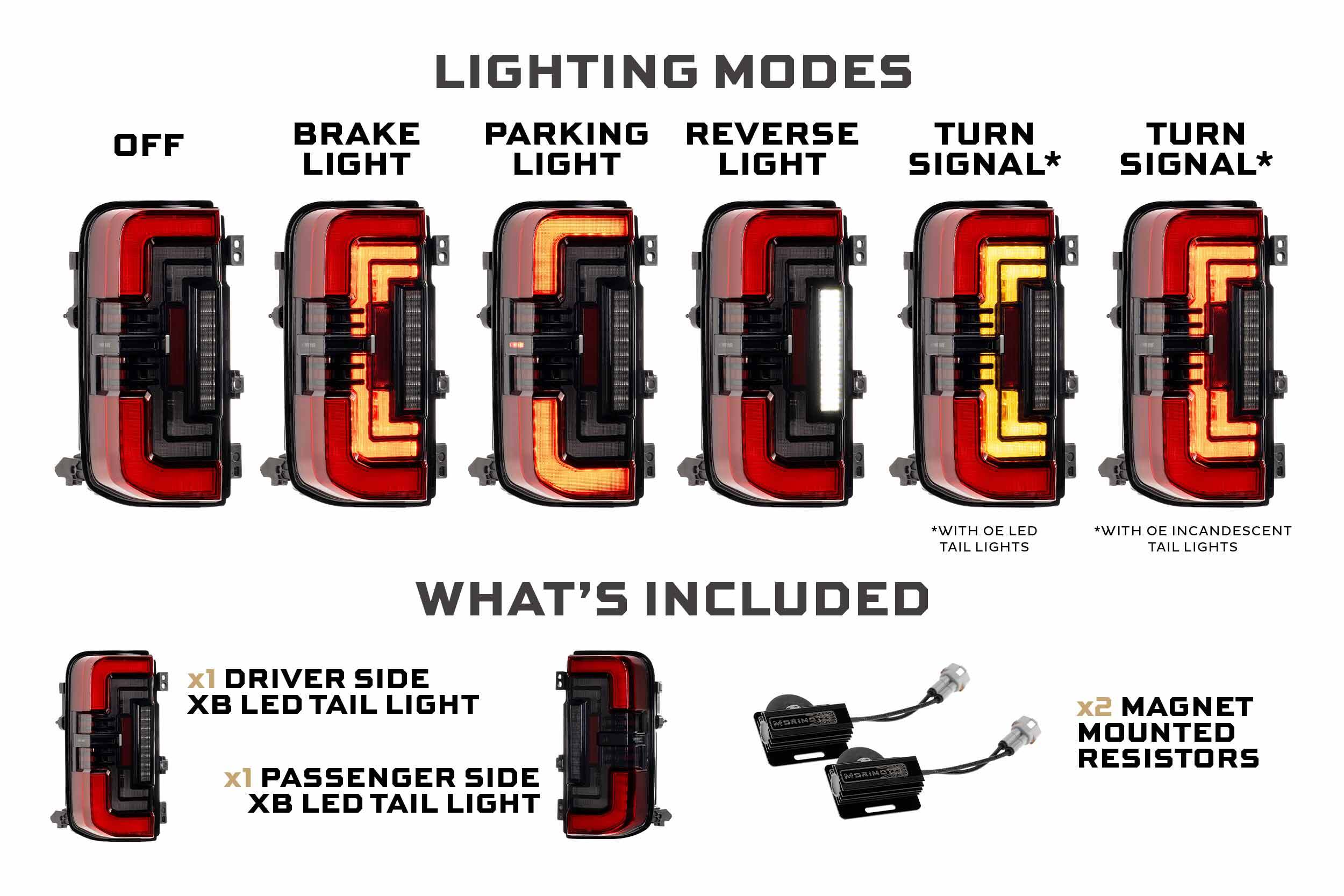 Ford Bronco: While every biz in the aftermarket has a catalog full of products for the new Bronco, somehow no brand has yet to deliver a worthy set of tail lights for this truck… until now. The Morimoto XB LED tail lights are the category killer that every Bronco owner has been waiting for. The low profile design. The advanced, high output optics. The fact that they work with every version of the truck… the XB Low-Pro Tail lights for the Ford Bronco are the full package!Reverse Lights: Are often over-looked, but not with the Morimoto XB tail lights for the Bronco. While they come standard with powerful LED reverse lights, just wait, there’s more! Morimoto’s BLBB system allows you to plug n play with the optional LED Backup Boost Bar which mounts to the top of your license plate frame and provides an extra 2,700 lumens of controlled light output in reverse. Yeah, Morimoto customers like to see where they’re going in reverse too!Style: A truly OEM+ design with a significantly lower profile, these look right at-home on the rear end of the Bronco. Dual rows of 3D Optics are illuminated from the rear with integrated TIR optics and serve as the brake light and turn signal. The parking light optic around the outer edge of the lights is equally impressive in the intensity department day or night. Pair that with the surrounding muscular trim, optional smoked or red outer lens, and we’ve easily got what is the best-looking set of low profile tail lights on the road for the Bronco.Style and Safety: All Morimoto tail lights are designed to comply with all DOT, SAE regulations for rear-facing lamps. We pride ourselves on offering stylish, high-performance and safe products for serious enthusiasts, which is why all new Morimoto products are verified by trusted third party labs for compliance and are backed with an industry-leading five-year warranty.